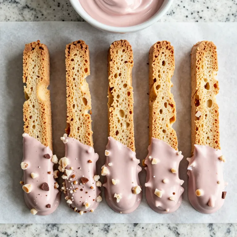 Golden-brown biscotti are artfully dipped in a glossy pink glaze, highlighting their crispy texture and airy interior. The bright, even lighting and shallow depth of field emphasize the biscotti, making this image perfect for culinary and food photography.