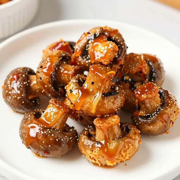 Crispy, glazed mushrooms with a golden-brown sesame crust glisten under soft overhead lighting, their tender caps coated in a sticky amber glaze. The shallow depth of field and tight close-up framing emphasize texture, with a clean, out-of-focus white background providing visual simplicity.