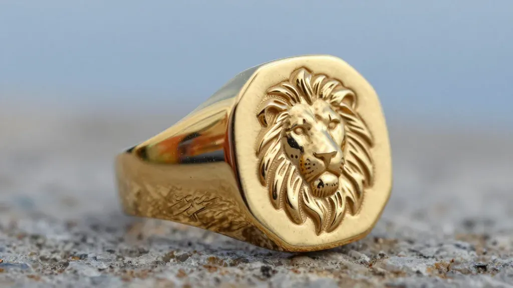 A close-up of a polished gold lion signet ring with detailed engravings, softly lit to highlight its smooth, reflective surface and create subtle shadows, set against a rough, textured stone background that contrasts with the ring's smoothness.