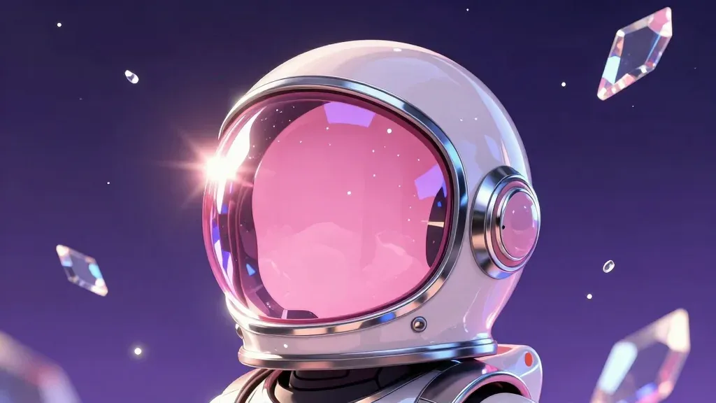 A close-up of a glossy, reflective astronaut helmet against a deep pink visor and metallic silver helmet, set against a starry cosmos background with diffused, soft lighting and floating diamond-like fragments. The shallow depth of field draws attention to the helmet's intricate details and the ethereal floating elements.
