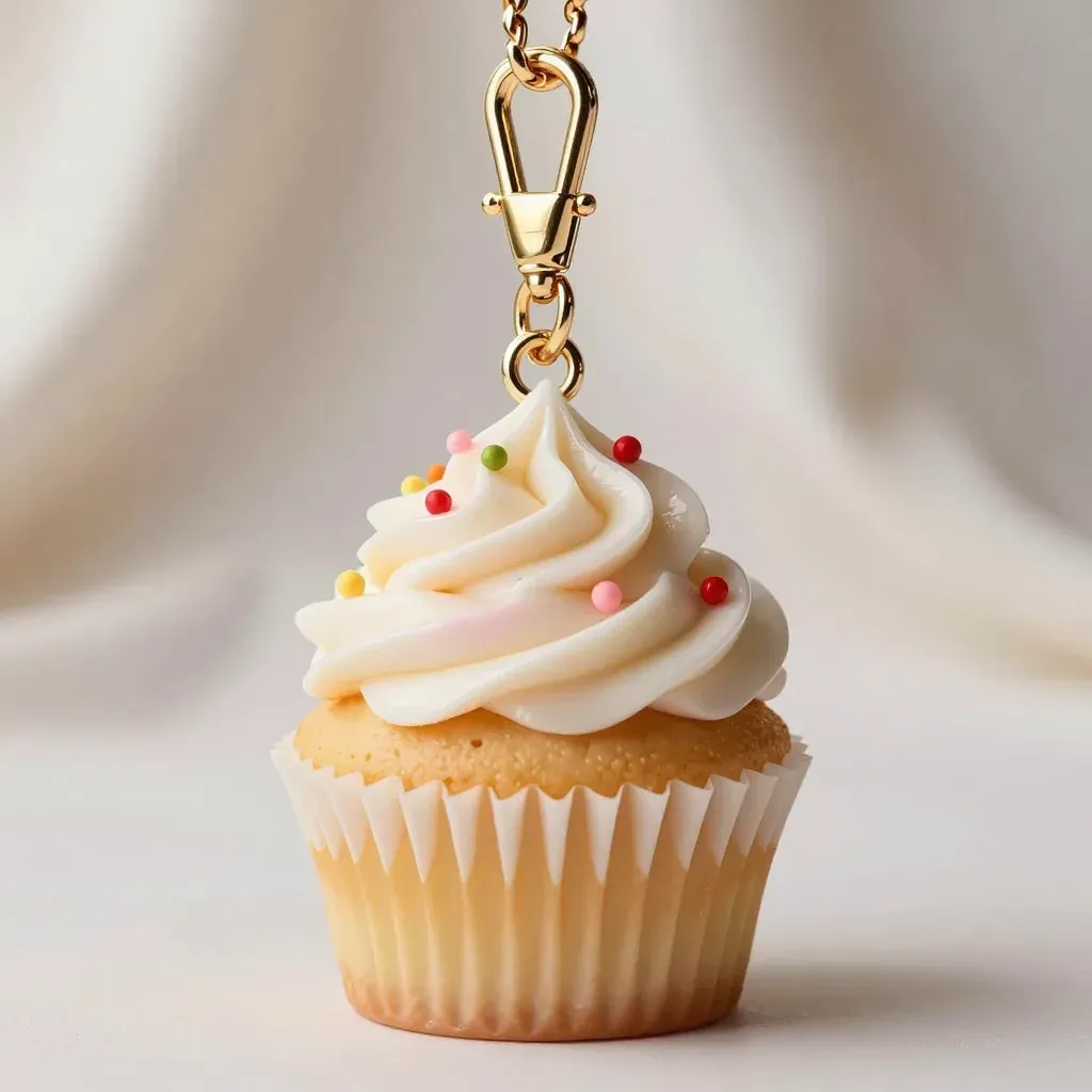 A close-up of a golden keychain attached to a cupcake with smooth frosting and glossy sprinkles, set against a soft, diffused light that highlights the textures and creates a shallow depth of field, emphasizing the clean, unobtrusive white background.