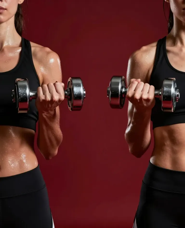A woman in a black sports bra performs a dumbbell curl, her skin glistening with sweat, showcasing defined muscles. The warm, focused lighting highlights her form against a solid deep red background, creating a striking contrast and shallow depth of field that draws attention to her muscular definition.