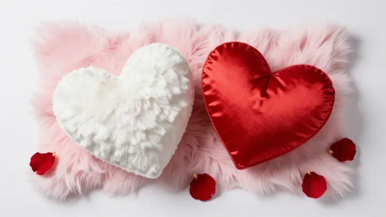A close-up of a fluffy white heart-shaped cushion adorned with glossy red rose petals, bathed in soft, natural light that creates gentle highlights and shadows. The minimal white background emphasizes the subject, offering ample copy space for design integration.