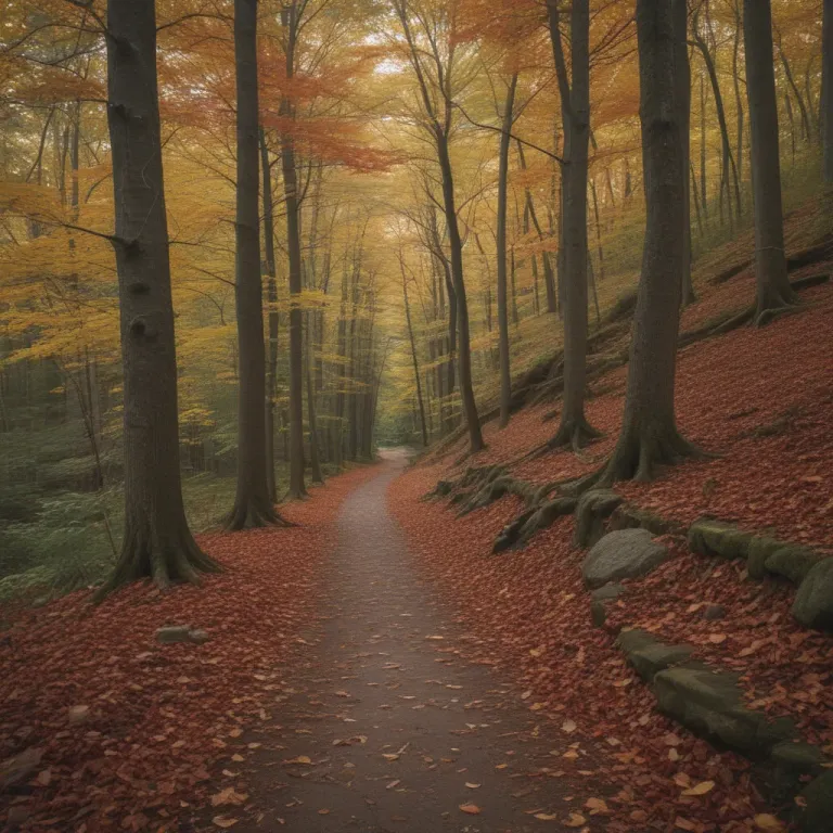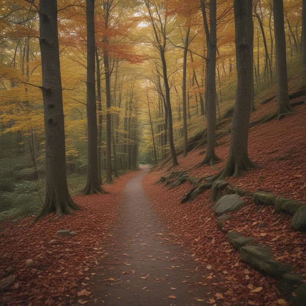 A glossy path meanders through a dense forest of golden leaves, with soft, diffused light filtering through the trees, creating a warm, inviting glow. The balanced framing and shallow depth of field emphasize the path and foreground elements, offering ample copy space for design purposes.