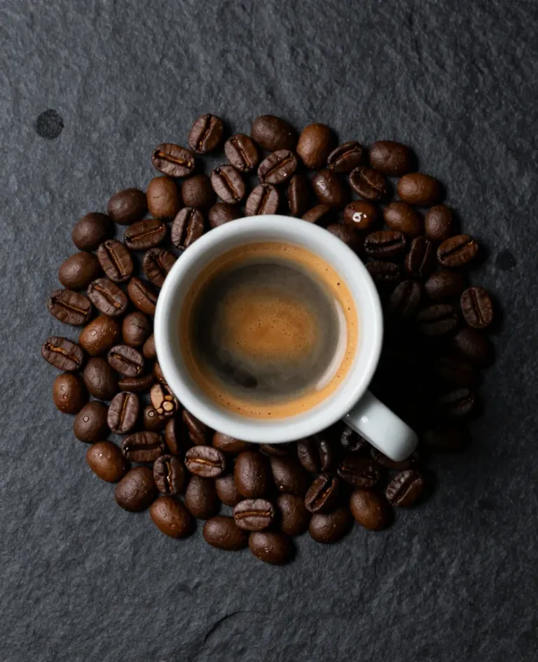 A smooth espresso cup is centered, surrounded by glossy coffee beans, creating a circular frame against a dark, textured background. Soft, diffused light highlights the rich brown tones of the coffee and beans, enhancing the visual depth and contrast.