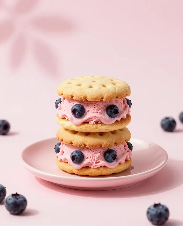 A stack of golden brown cookies filled with creamy pink ice cream and glossy blueberries, set against a soft pink background with scattered blueberries, creating a clean and simple backdrop. The soft, diffused lighting highlights the textures and colors of the sandwiches, emphasizing their inviting appearance.