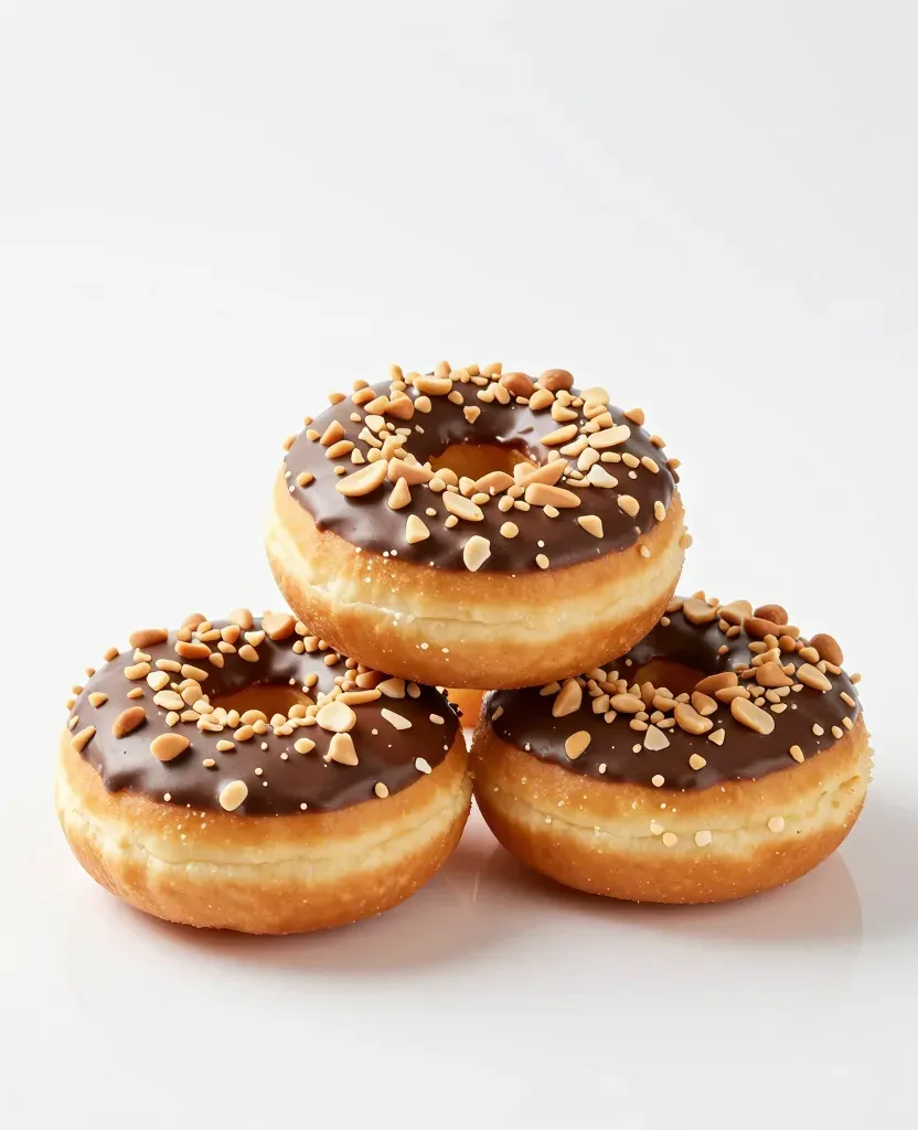Stacked chocolate-glazed donuts with peanuts create a glossy, textured appearance under soft, diffused lighting, emphasizing their rich brown tones and light beige peanuts against a clean white background.