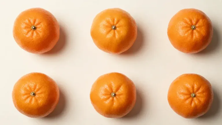Tangerines arranged in a symmetrical grid pattern with a glossy, textured peel and a soft, diffused lighting creating gentle shadows. The clean, off-white background enhances the vibrant orange hue and provides ample copy space.