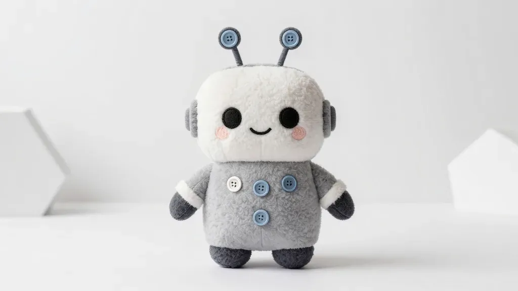 A soft, fluffy gray plush robot toy with button-like eyes and a subtle pink blush on its cheeks, set against a clean, white background. The diffused, even lighting highlights the toy's features and creates a sense of simplicity and focus.
