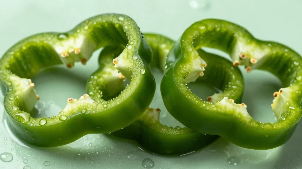 Overlapping rings of fresh green bell pepper showcase a waxy skin, crisp inner flesh, and gelatinous seeds, glistening with dewy water droplets. Soft diffused lighting and shallow depth of field emphasize texture and depth, with a clean mint-green background providing minimal distraction.