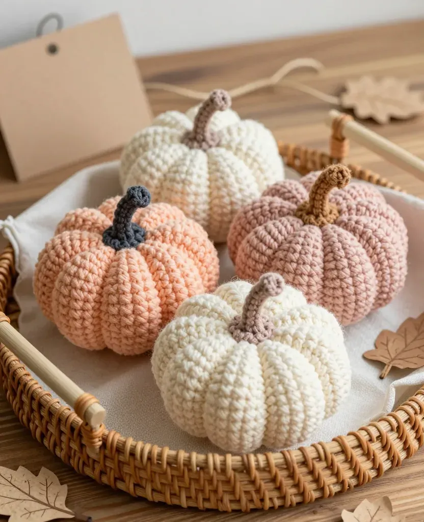 Four crocheted pumpkins in soft pastel shades arranged on a woven tray, bathed in warm, diffused light with gentle shadows, creating a cozy, autumnal scene.