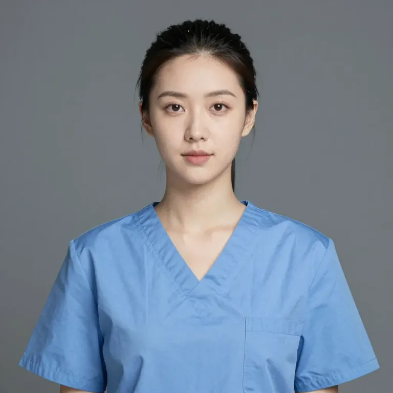 A serene nurse with neatly pulled-back hair and a calm expression, wearing smooth, slightly textured blue scrubs. Soft, diffused light from above creates gentle shadows, emphasizing her calm demeanor against a neutral gray background.