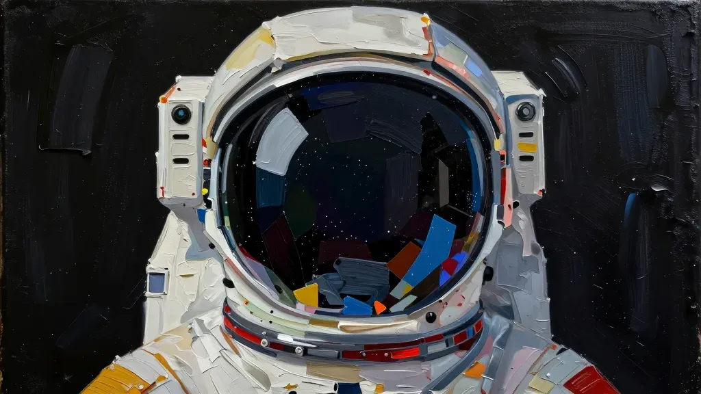 A glossy, reflective astronaut's helmet with visible ridges and panels, set against a starry space background. The soft, diffused lighting highlights the helmet's surface, creating a sense of depth and focus on the subject.