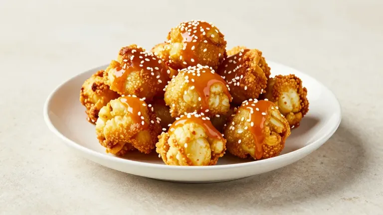 Golden-brown fried cauliflower bites are clustered on a white plate, coated in a glossy amber glaze and sprinkled with dry sesame seeds, showcasing a crispy exterior and implied soft interior. Soft diffused overhead lighting creates subtle highlights on the glaze and seeds, with shallow depth of field and a neutral beige background enhancing subject focus.