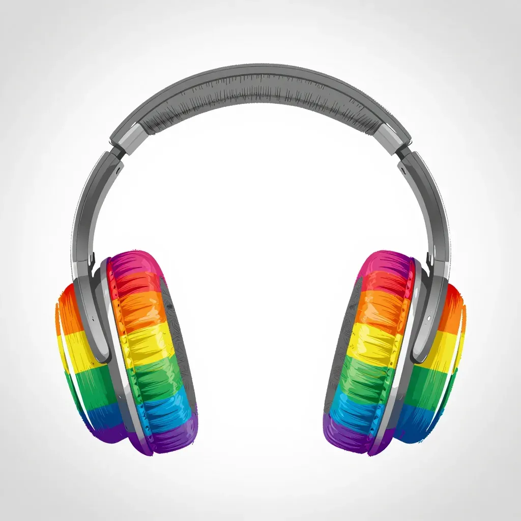 A pair of over-ear headphones featuring a vibrant rainbow flag design, with glossy, smooth paint strokes and soft, diffused lighting creating gentle highlights and shadows. The plain white background provides a stark contrast, making the headphones stand out as a strong focal point.
