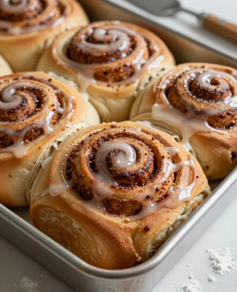 Golden-brown cinnamon rolls in a baking pan are coated with a glossy white icing, highlighting their soft, fluffy texture and spiced filling. The diffused, warm lighting accentuates the glossy icing and the golden brown color of the rolls, creating a visually appealing close-up shot.