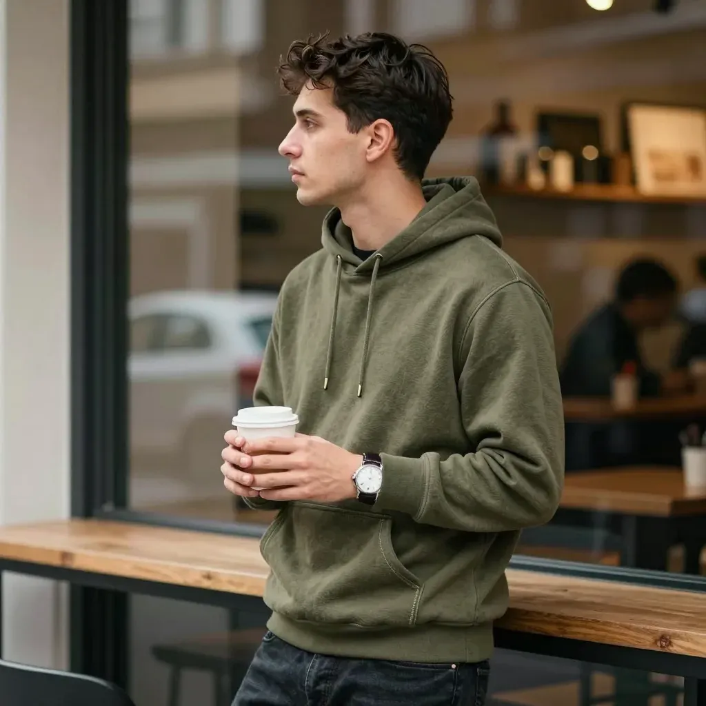 A young man in an olive-green hoodie holds a glossy white coffee cup, standing by a cafe window bathed in natural light. The soft shadows and highlights create a warm, inviting atmosphere, while the blurred background of wooden shelves and indistinct figures adds depth and context.