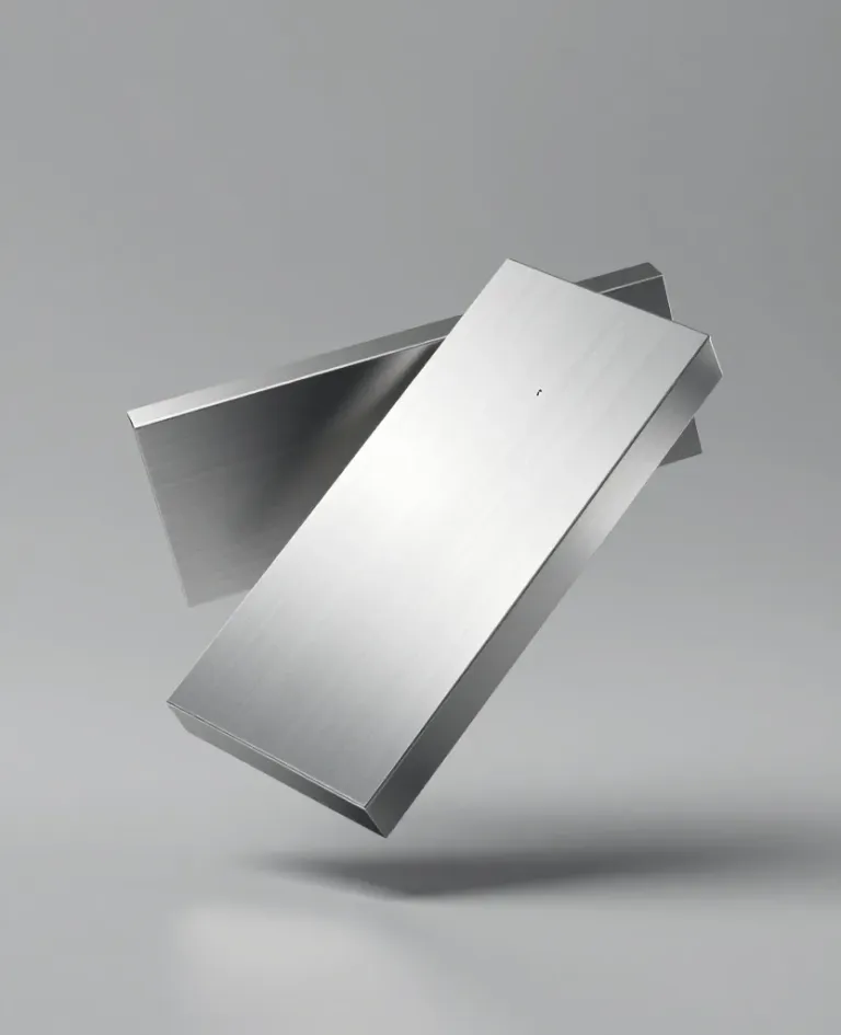 Two brushed metal bricks float symmetrically in mid-air, illuminated by direct overhead light that creates sharp shadows and highlights, emphasizing their smooth, reflective surfaces. The soft, neutral gray background provides a clean contrast, enhancing the focus on the floating bricks.