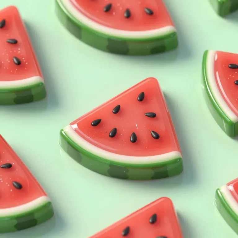 Close-up of glossy, smooth, and slightly translucent watermelon slices with black seeds, set against a uniform mint green background. The direct, overhead lighting creates a high-gloss finish and subtle shadows, emphasizing the texture and vibrant colors of the watermelon slices.
