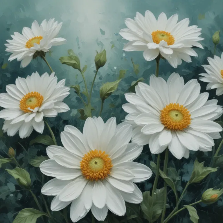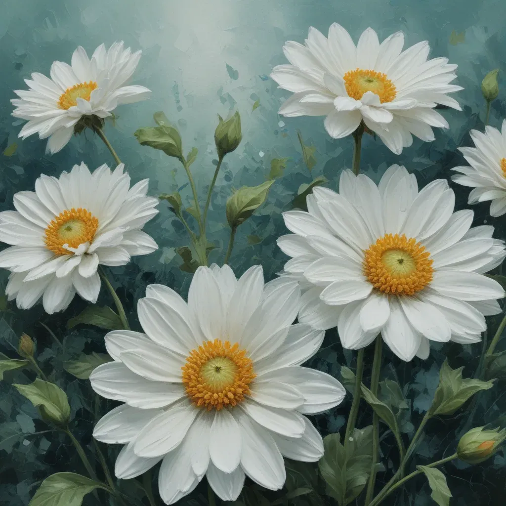 Close-up of white daisies with yellow centers, painted using thick impasto technique, creating a glossy, three-dimensional effect. The diffused lighting highlights the petals and centers, set against a soft teal background that complements the flowers.