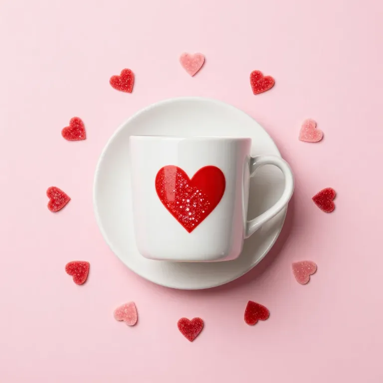 A white ceramic mug featuring a red glitter heart sits on a matching saucer, surrounded by scattered paper hearts in red and blush pink. Soft, diffused overhead lighting creates subtle shadows, and the flat lay composition with a clean, uniform pink background provides ample copy space.