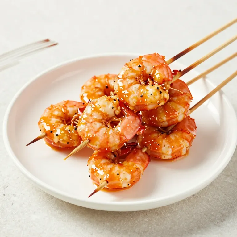 Cluster of grilled shrimp skewers coated in a glossy, caramelized glaze and sprinkled with toasted sesame seeds, arranged on a white plate. Soft diffused lighting from the upper left enhances texture and creates shallow depth of field, with a clean neutral background providing visual focus.