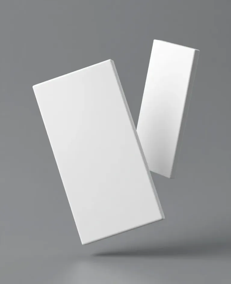 Two glossy white cuboids float mid-air, softly lit from the side, casting subtle shadows. The uniform gray background provides a clean, distraction-free backdrop.