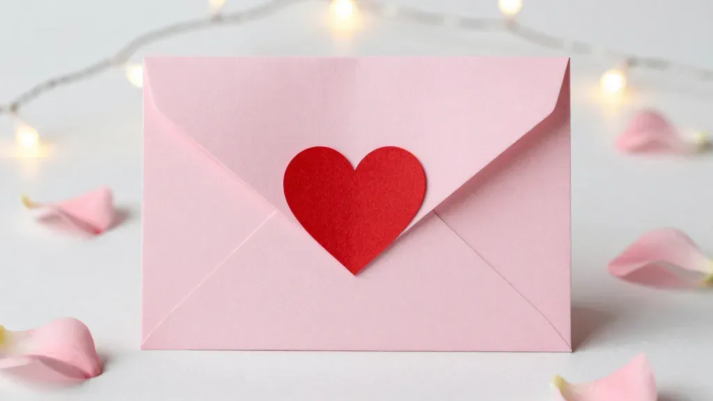 A glossy pink envelope with a heart-shaped cutout, softly lit from above, creating gentle highlights and shadows, set against a blurred background with scattered pink petals, adding depth and a natural touch.