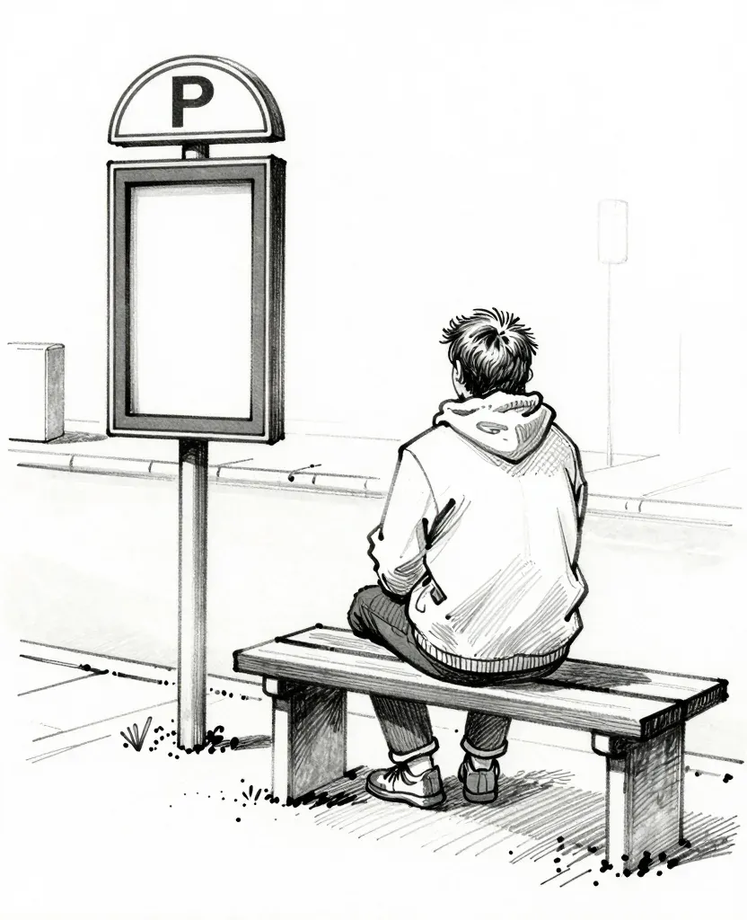 A young person sits on a worn wooden bench, back to the viewer, wearing a fluffy light hoodie, under soft, diffused light that creates gentle shadows and a quiet atmosphere. The blurred background suggests depth and a sense of place, possibly a bus station or urban area.
