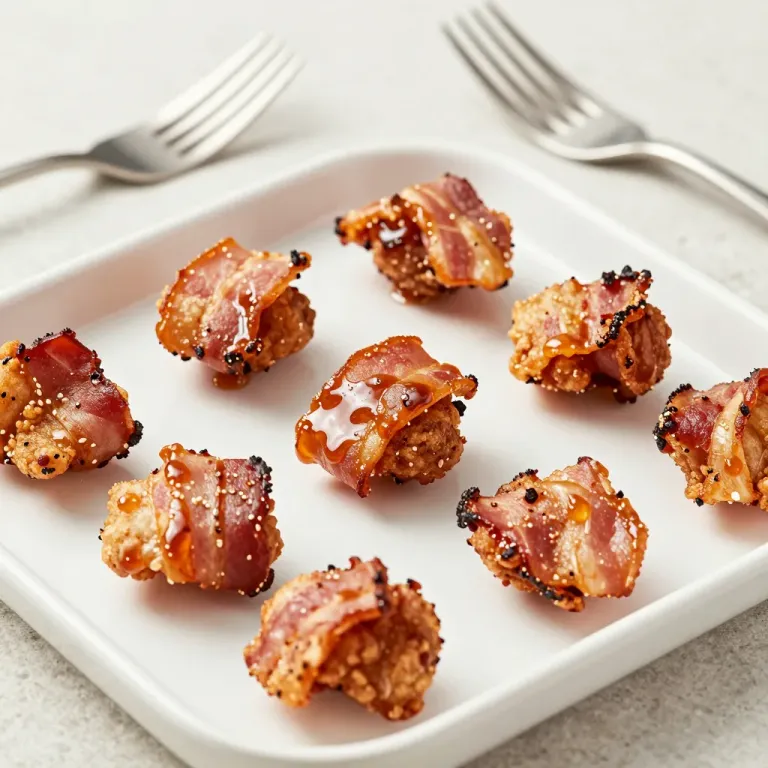 Crispy bacon-wrapped appetizers with caramelized, glossy exteriors are arranged in a scattered pattern on a smooth white ceramic platter, revealing dense, moist fillings beneath. Soft directional lighting from the upper left creates subtle highlights and gentle shadows, while a shallow depth of field blurs background forks, emphasizing the foreground and providing clean copy space.