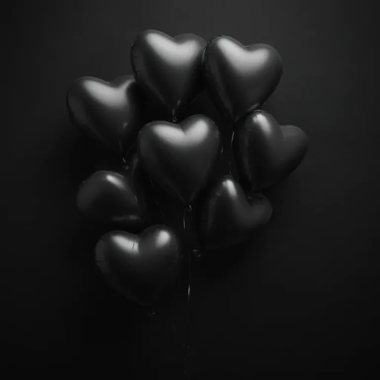Glossy, smooth, velvety heart-shaped balloons cluster together against a dark, monochromatic background, subtly illuminated to highlight their reflective surfaces. The composition is centered, creating a sense of unity and elegance.