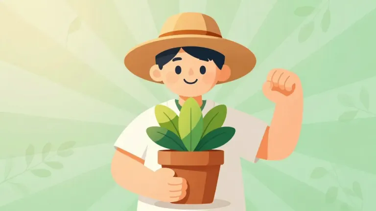 A botanist carefully holds a small plant with glossy green leaves in a smooth terracotta pot, set against a soft, natural light from above, creating gentle shadows. The blurred green foliage in the background suggests a serene garden setting.
