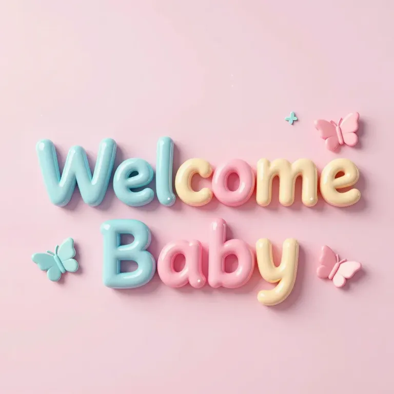 A glossy, balloon-like 'Welcome Baby' sign with pastel colors and butterflies, illuminated by soft, diffused light from above, creating gentle highlights and shadows. The clean, solid pink background enhances the vibrant, playful arrangement of the text and butterflies.