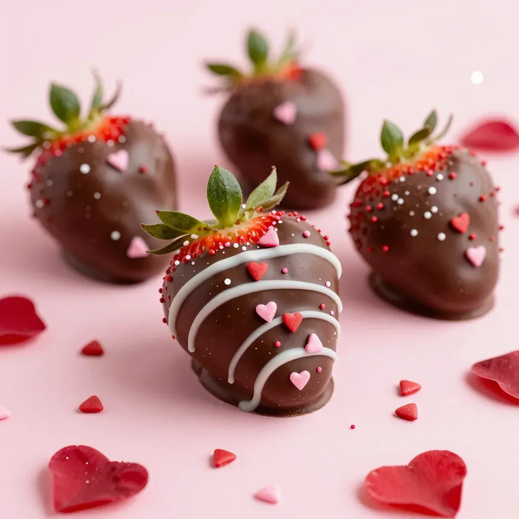 Four plump strawberries coated in glossy dark chocolate, one adorned with white chocolate drizzle and pink heart sprinkles, set against a soft pink backdrop with scattered translucent hearts. The shallow depth of field emphasizes the central strawberry, while soft diffused lighting enhances the rich textures and creates gentle highlights on the chocolate surfaces.