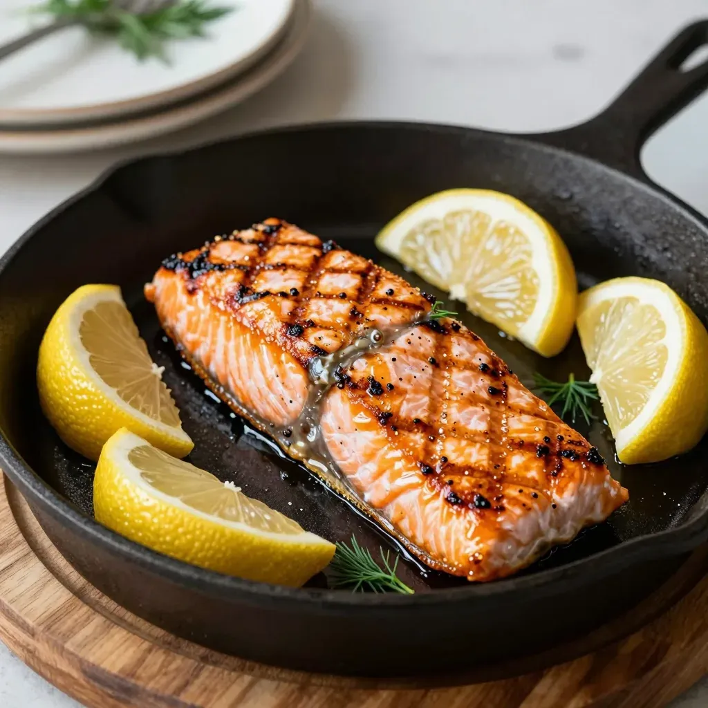 A glossy grilled salmon fillet sits in a cast iron skillet, surrounded by lemon wedges and dill, bathed in soft natural light that highlights the texture and sheen of the salmon and sauce. The blurred background with a wooden cutting board and plate in the distance keeps the focus on the main subject, creating a balanced and inviting presentation.