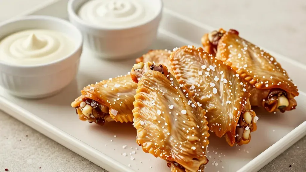 A close-up of flaky caramelized pastry dusted with coarse salt, bathed in soft, diffused light that highlights the glossy surface and salt. The clean, white background emphasizes the pastries and creates a minimalist aesthetic.