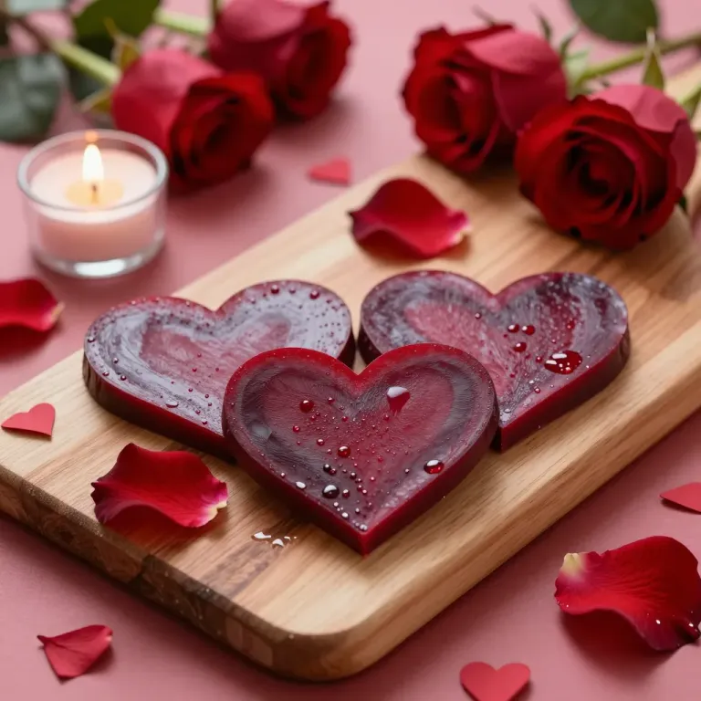 Three glossy heart-shaped beetroot slices rest on a wooden cutting board, glistening with moisture droplets and surrounded by scattered red rose petals. Soft warm light from the upper left creates gentle highlights and shallow depth of field, with a blurred pink background featuring a lit candle and out-of-focus roses.