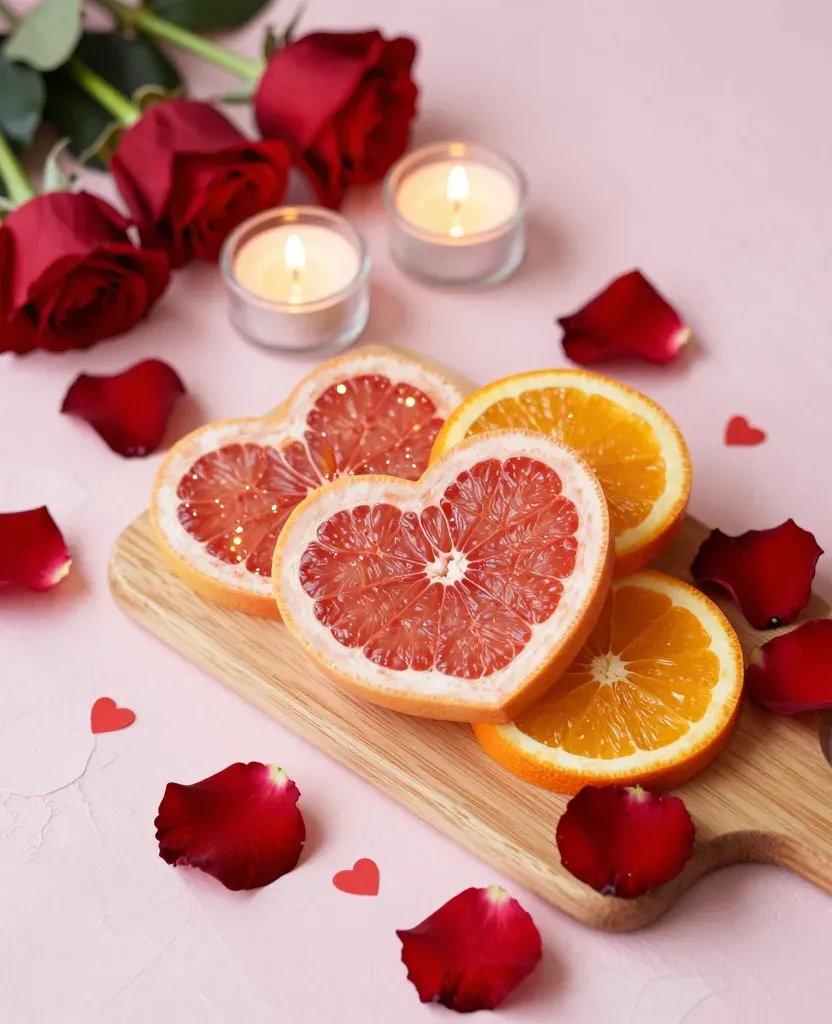 A heart-shaped citrus medley on a wooden cutting board, illuminated by soft tealight candles, creating a romantic and intimate atmosphere. The balanced composition and warm lighting highlight the glossy textures of the citrus and the rough wood, making it perfect for a Valentine's Day or romantic setting.
