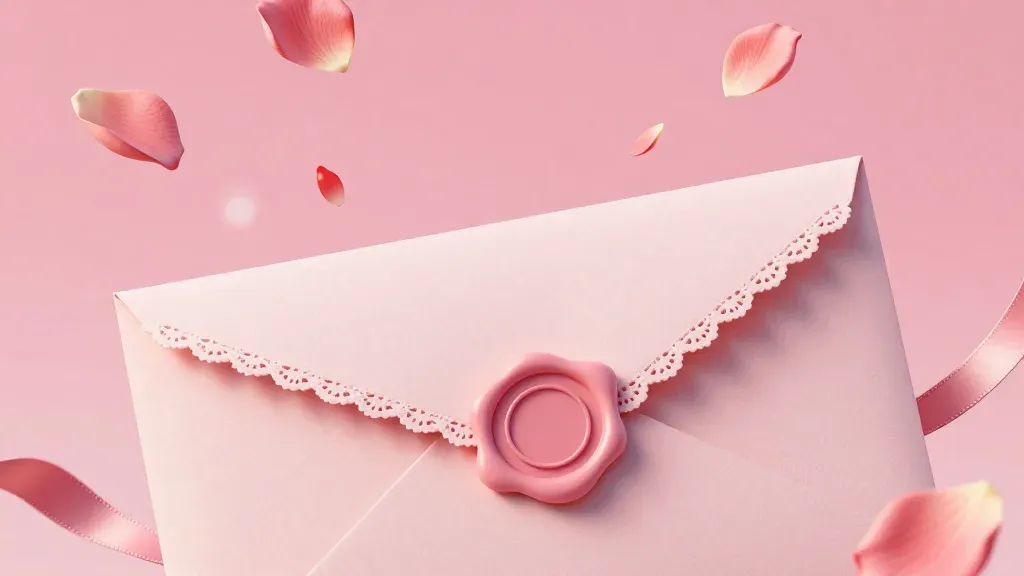 A glossy lace-edged envelope surrounded by soft, delicate rose petals, bathed in subtle diffused light, creating a dreamy, romantic atmosphere. The composition is centered, with ample copy space, ideal for wedding invitations or love-themed designs.