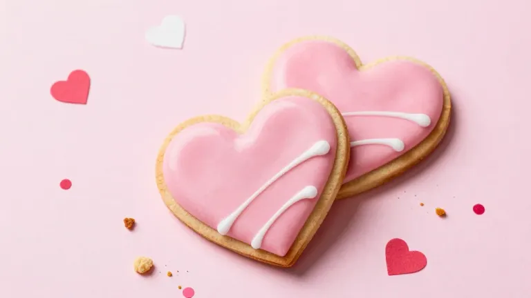 Close-up of heart-shaped cookies with glossy pink icing and white drizzle, softly lit to highlight the texture and create gentle shadows, with a shallow depth of field blurring the background, adding a playful and romantic atmosphere.