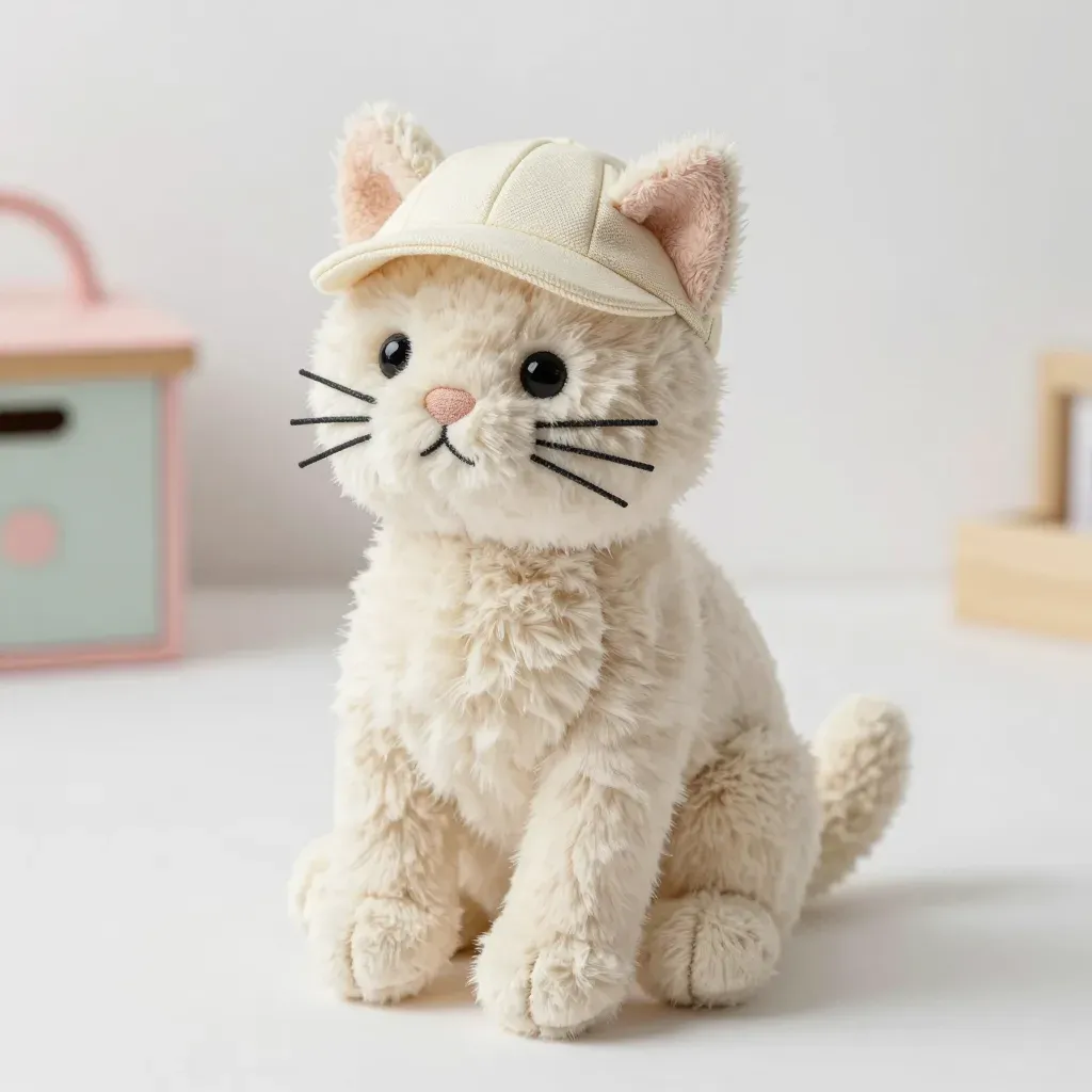A soft, fluffy white plush cat dons a light beige baseball cap, sitting in a clean, minimalistic room with soft, diffused lighting and a blurred background of pastel-colored storage boxes. The shallow depth of field draws attention to the subject, creating a cozy and charming atmosphere.