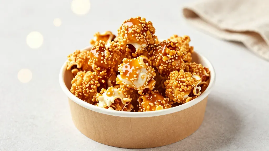 Glossy caramel-coated popcorn kernels with golden sesame seeds are piled in a natural beige paper bowl, showcasing a rich texture contrast between the crunchy kernels and smooth coating. Soft front lighting creates gentle reflections on the caramel and a shallow depth of field emphasizes the subject against a clean, out-of-focus background with bokeh highlights.