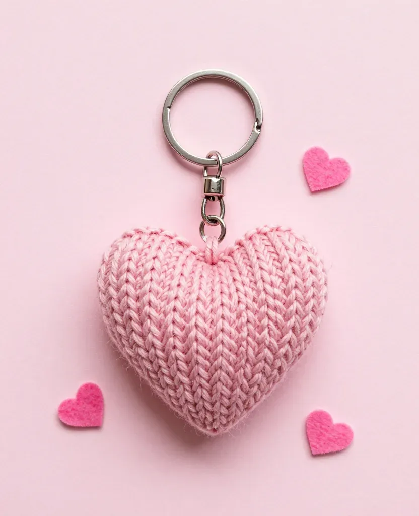 A soft, knitted heart keyring with a metallic ring and chain, surrounded by small felt hearts, set against a soft, diffused light that highlights the texture and creates gentle shadows, creating a balanced and harmonious arrangement on a clean pastel pink background.
