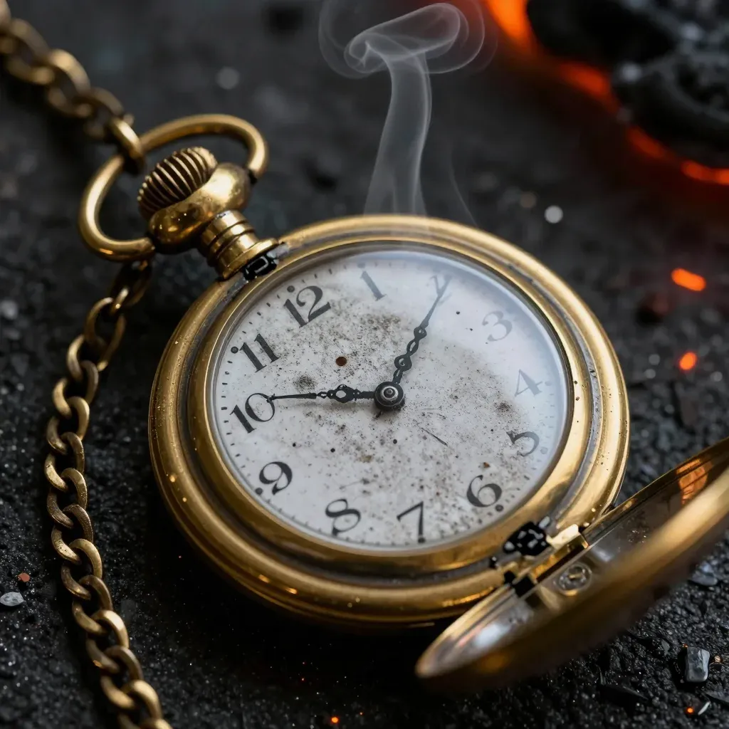 A close-up of an antique pocket watch with a weathered gold casing and a dusty, smoky watch face, illuminated by diffused, soft light that creates a hazy glow and subtle highlights. The dark, textured background with hints of orange light adds depth and contrast to the image, emphasizing the watch's intricate details and the atmospheric smoke.
