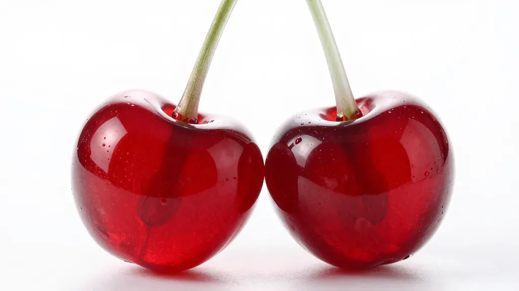 Two glossy cherries with deep red color and smooth texture, softly lit to highlight contours and cast gentle shadows, set against a clean white background with shallow depth of field, providing a focused and elegant presentation.