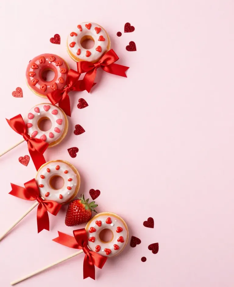 A close-up of donuts on sticks adorned with glossy white icing, red sprinkles, and red ribbons, set against a soft pink background. The gentle diffused lighting highlights the glossy texture of the donuts and creates a romantic, celebratory mood.