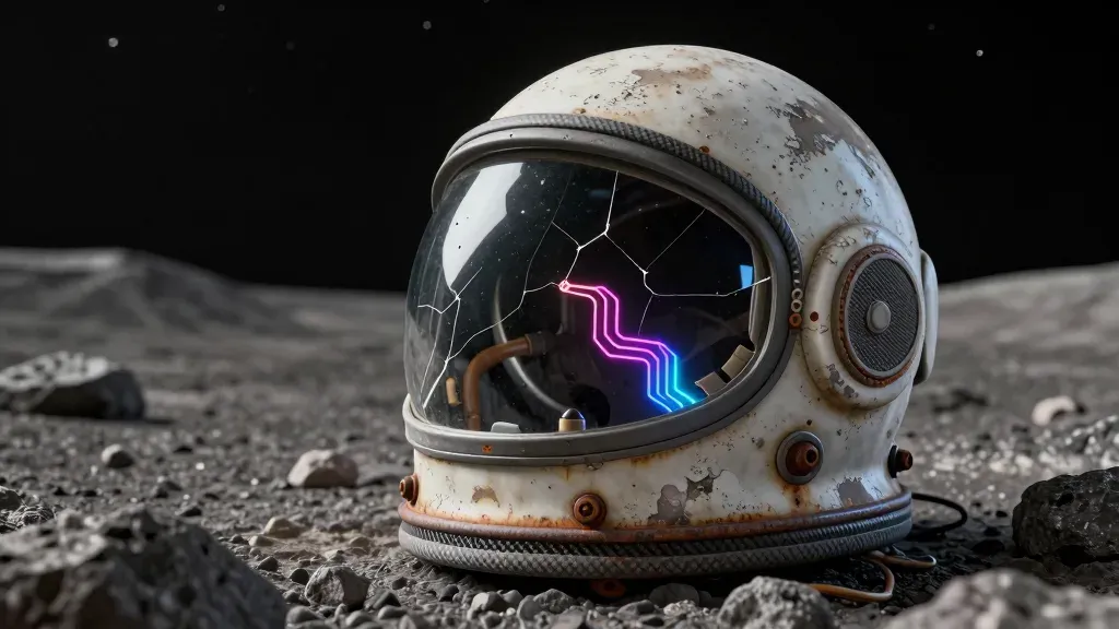 A cracked astronaut helmet with neon lights within its visor glows against the stark lunar landscape, highlighting the helmet's texture and the surreal glow of the lights. The close-up shot and low angle emphasize the helmet's details and the barren, star-filled background.