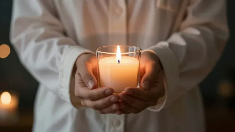 A person's hands gently cradle a lit candle, casting a warm glow that illuminates their soft, smooth skin and glossy glass. The shallow depth of field isolates the hands and candle, creating a serene and intimate atmosphere.