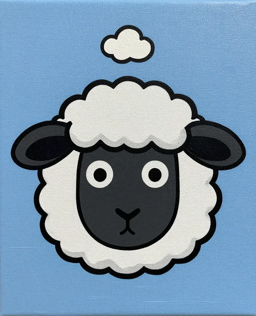 A sheep with a black face and ears stands against a light blue background, featuring soft, fluffy wool and even, soft lighting. The minimalistic composition and slightly blurred background provide ample copy space for various design applications.