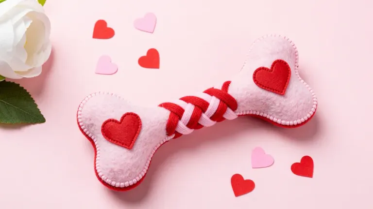 A soft felt bone-shaped toy adorned with red hearts and a braided pattern rests on a blush pink surface, accompanied by scattered paper hearts and a white rose with delicate petals. The soft diffused lighting creates gentle highlights and shallow depth of field emphasizes the foreground elements against a clean, minimal background.